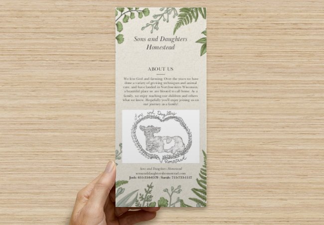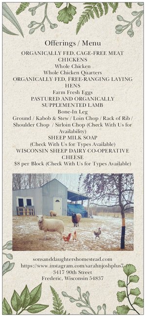 Some more helpful information on signage and labeling that I found was that if you gross $5,000 or more in a year (that’s before deductions), you need to not have organic in your materials unless you are certified. There seemed to be some debate about “organically-raised”, but to be safe, I decided not to do this. With our site we emphasize how we raise our animals and make our products, which are local (only sold within 400 miles of our homestead), pastured (spending the majority of the time with access to open areas – we live in Northern Wisconsin, so our animals are in a barn or coop over the coldest parts of winter briefly), and organically-supplemented (we give very small amounts of organic grain to our sheep, so they are not 100% grass fed after weaning, and we also give organic grain to our chickens, because despite that they are pastured, they could not survive off of grass only and therefore no chicken is ever grass-fed). Cutting to the point, I had to redo some of our marketing materials and signage, so here are our updated versions: